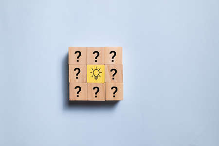 selected wooden cube block with light bulb icon symbol and icon question mark creative concept. new ideas
