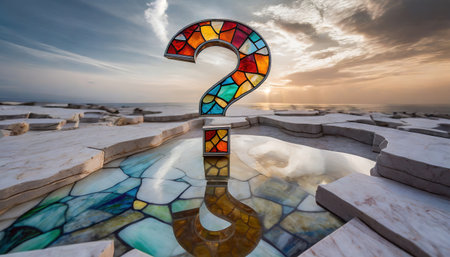A large stained glass question mark sculpture stands on a reflective surface outdoors against a dramatic sunset sky, casting colorful reflections on the ground.