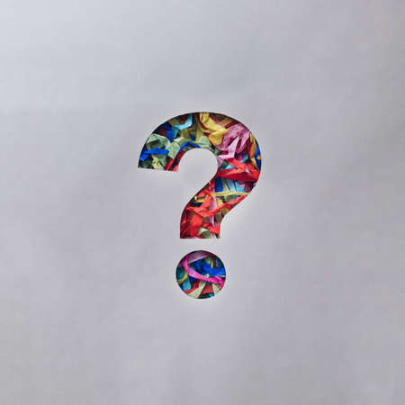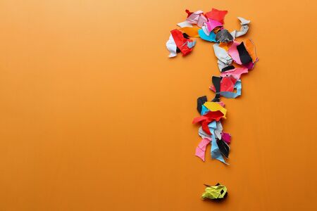 Question mark made from pieces of torn colored paper, abstract background with copyspace for text