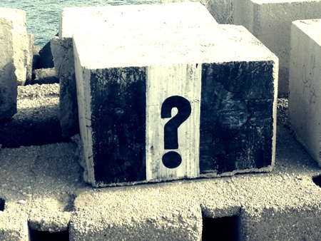 closeup of a young caucasian person with a question mark in front of her or his face, with the ocean in the background