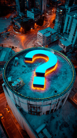 A large, glowing question mark is displayed on the top of a building in an urban setting at night.