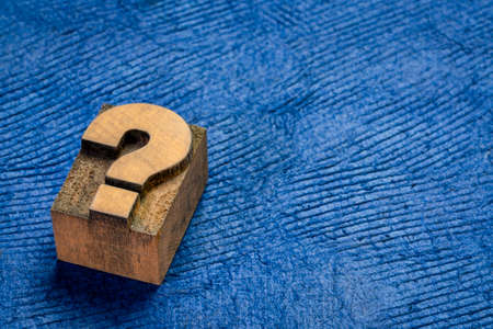 question mark - vintage letterpress printing block on blue handmade paper, question, doubt or uncertainty concept