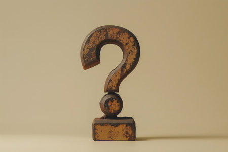 Aged, rusty question mark sculpture poised elegantly against a warm, plain backdrop, invoking a sense of mystery and curiosity