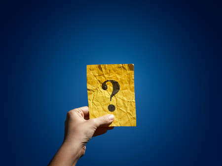 A woman holding a yellow note paper with a question mark on it in her hand over a blue sky. close up.