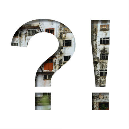 Font on an abandoned industrial building. Exclamation and question marks cut out of paper on a background of windows and doors of an abandoned industrial building. Set of decorative fonts.