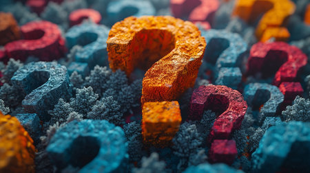 A layered arrangement of tactile white cards adorned with striking black question symbols, embodying the spirit of wonder and the quest for clarity amidst ambiguity.