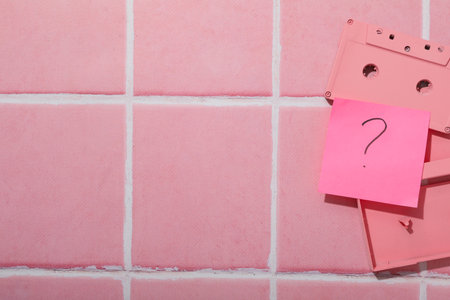 Memo piece of paper with drawn question marks, felt-tip pen on colored background. Top view. Minimalism