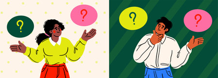 A man and woman shown thinking with question marks above their heads, cartoon style, on light and dark backgrounds. Concept of decision making. Vector illustration