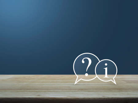 Question mark and information chat icon on wooden table over light blue gradient background, Customer support concept