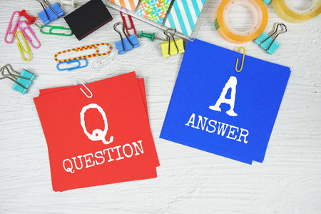 Q&A. Where, Why, What, When, Who, How write on sticky notes. Isolated on white table background