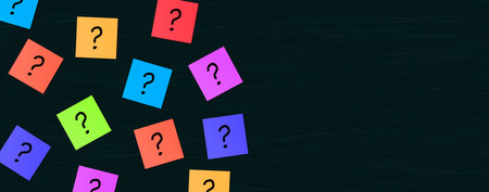 A vibrant arrangement of colorful sticky notes featuring question marks, set against a gray background, ideal for concepts related to brainstorming and decision-making.