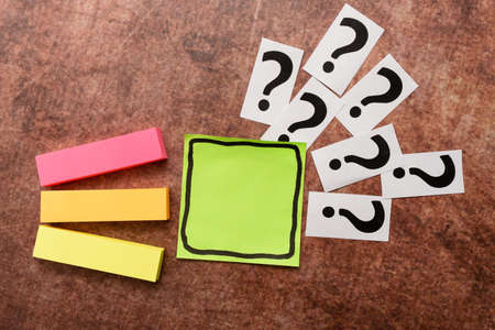 Many Question mark on wooden background. Colorful Sticky Note with questions marks. Business Question and solution concepts