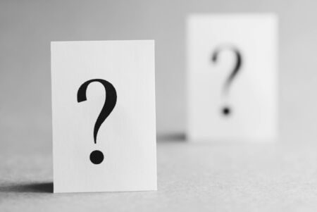 Two question marks printed onto white cards placed to the side one behind the other with focus to the paper in the foreground over grey