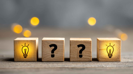 A creative composition of wooden blocks featuring light bulb symbols and question marks. A soft, blurred background enhances the concept of ideas and inspiration.