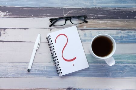 Question mark on pink sticky note with pencil and coffee on blue table background. Business and education concept design.