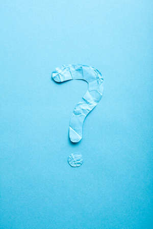 Crumpled paper question mark on blue paper background.