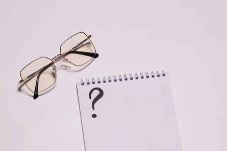 Glasses on a white background, next to a notebook with a question. Vision correction, selection of glasses. Optics. Flat lay.