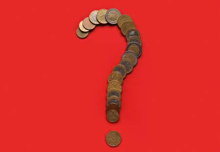 Question mark made of golden coins on red background
