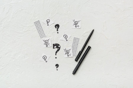 Memo piece of paper with drawn question marks, felt-tip pen on colored background. Top view. Minimalism
