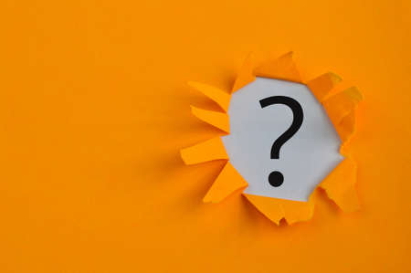 question mark symbol from a teared yellow paper on a blue background with copy space. Concept of FAQ, Q and A, Questions and riddle