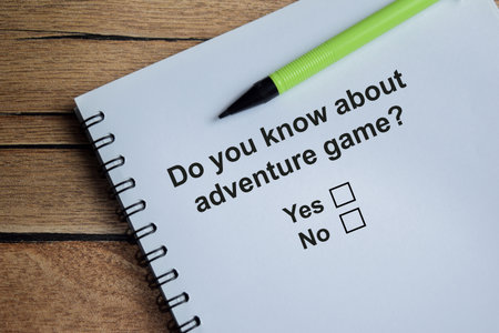 Do you know about adventure game written on book isolated on Wooden Table. A person is answering question concept