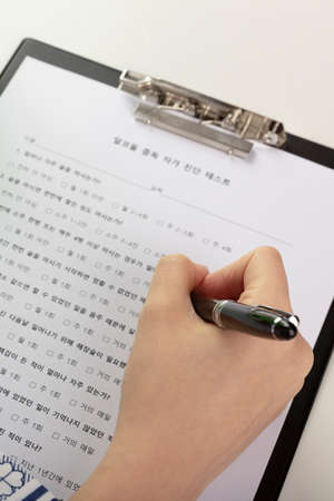 Close-up of Hand using writing pen with questionnaire or paperwork survey question filling in business company personal information form checklist document.