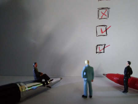 Silhouette of three businessmen mini figures, meeting and check list concept