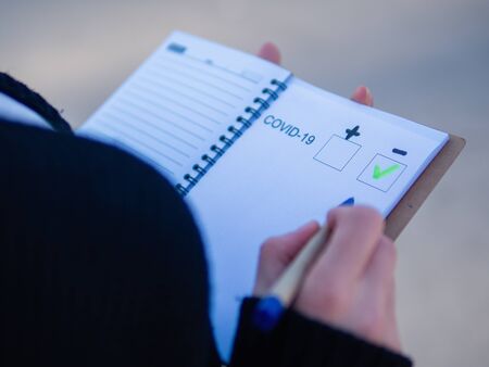 COVID-19 coronavirus pandemic concept, Nurse writing on a paper a COVID positive check, with flagged corona virus checkbox, quarantine of tourists infected coronavirus.