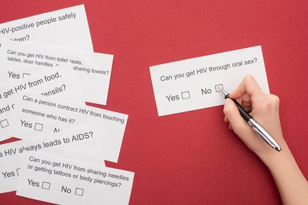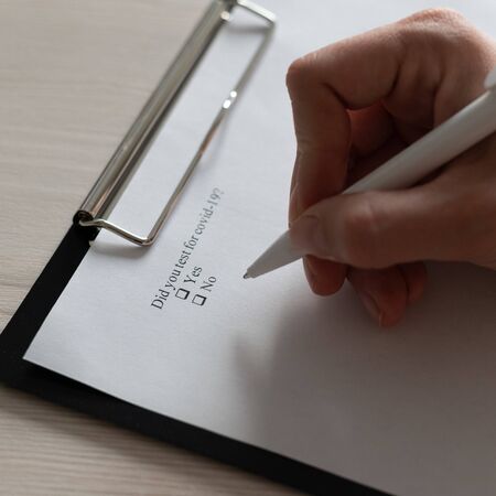 Unrecognizable woman puts a daw in the questionnaire. A close-up of a female hand answering about a a covid-19 question. marking in a checkbox