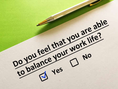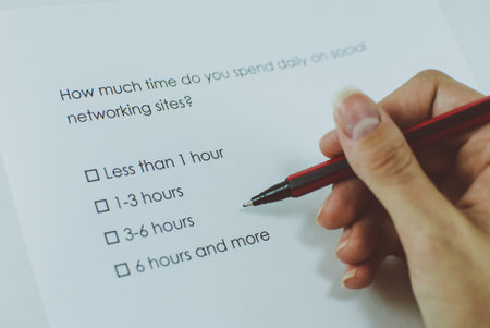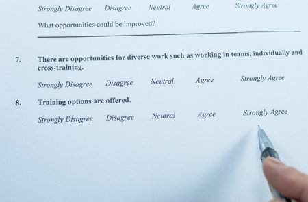 Respondent holding a pan in a hand and answeing questions in employee survey. Questions relating to managerial practices, corporate culture, career growth, and professional relationships. Close-up