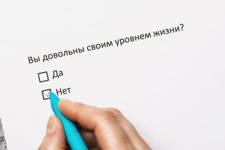 The inscription in Russian: are you satisfied with your standard of living? The concept of an anonymous survey where a person answers no