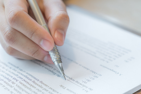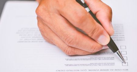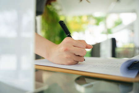 Close-up of Hand using writing pen with questionnaire or paperwork survey question filling in business company personal information form checklist document.