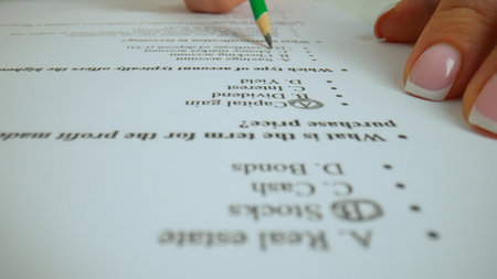 Close up shot of woman at the desk working with important exam document, student reading and picking answers in test, circling with pencil letters for questions.