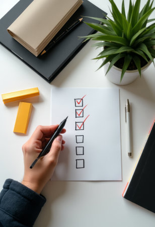 A hand holds a pen poised over a neatly drawn checklist, with several boxes ticked off in red ink, symbolizing progress and accomplishment. Surrounding the checklist are vibrant yellow blocks, a sleek pen, and a potted plant, creating a harmonious workspace that inspires motivation and focus.