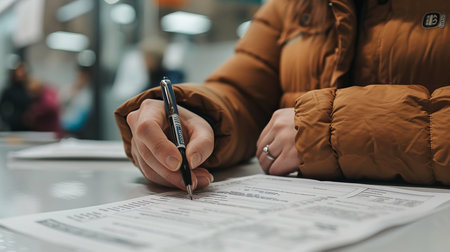Minimalistic immigration office photo reportage person filling forms in bright, clean setting