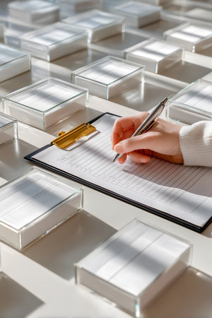Individual is writing on a clipboard with a pen, surrounded by transparent storage boxes, emphasizing organization and clarity in a well-lit environment