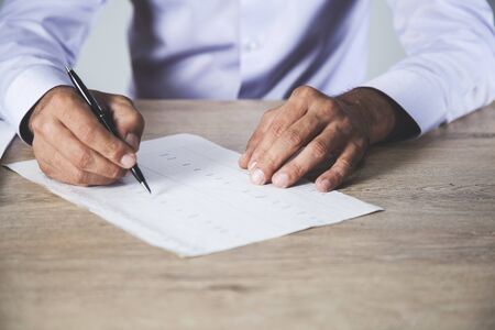 Man filling out a questionnaire on a wooden table. Horizontal composition. Elevated view.