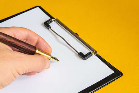 The hand holds stylish pen for writing text on a blank sheet of paper