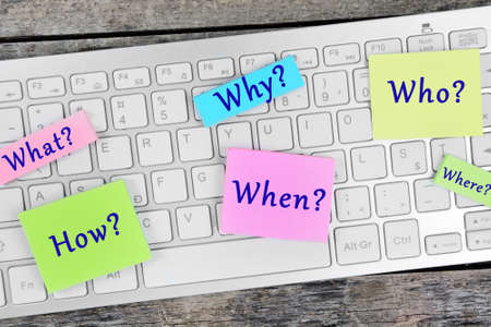 Who, What, When, Where, Why, How write on a sticky note isolated on office desk.