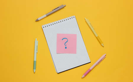 Notepad with pens and memo piece of paper with question mark on yellow background. Top view