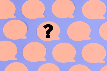 Question marks are written on blue stickers in the form of a bubble