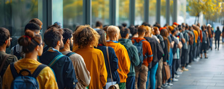 A diverse crowd of young adults are gathered outdoors, appearing to wait for entry or an event.