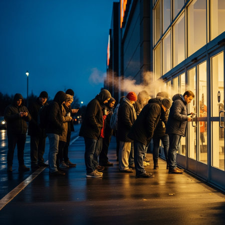 People queue up waiting outside for stores to open for shopping. Sale and discounts, black Friday, shoppers lined up, municipal or other public event
