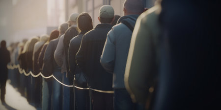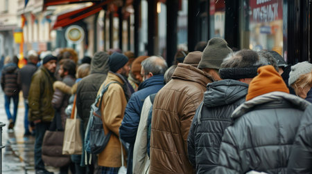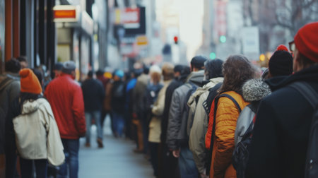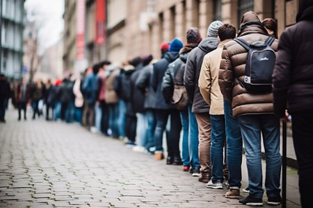Unemployment rate. Numerous people standing in line outside the employment center, hoping to find a job. Blurred effect, soft focus