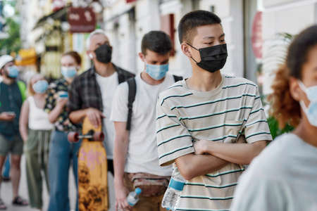 Young asian guy wearing mask waiting, standing in line with other people, respecting social distancing to collect his takeaway order from the pickup point during coronavirus lockdown