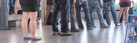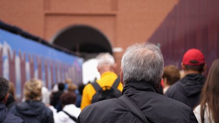 Big queue. Many, multitude people waiting in long line, back view. Crowd of tourists, refugees, men, women, children queuing. Migration concept waiting in line copy space