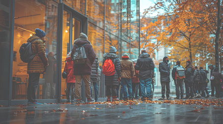 Long Queue of People Standing Along Cobblestone Street in Autumn Cityscape. High quality photo