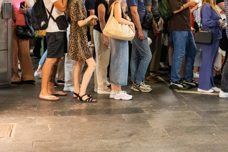 Passengers wait in line for subway train, anticipating boarding and journeying to their destinations within the bustling urban transit network.AI Generated
