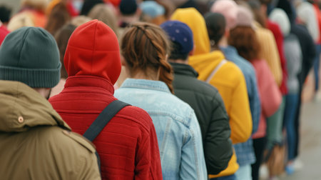 some people standing in a long line with one person looking at his phone and the other is wearing a hat. Generative AI