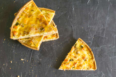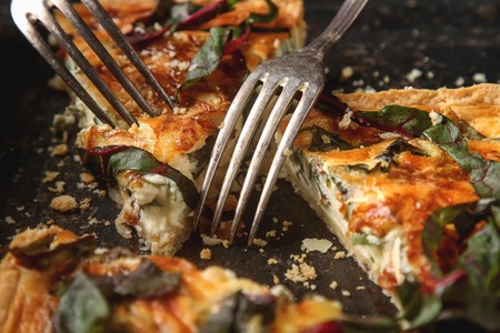 Traditional French cake. quiche with chard. Dark background. free space text. Top view